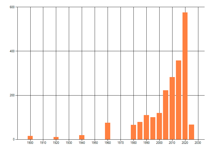 Het aantal atlasblokken (5x5 km) waarin de soort is gemeld binnen een periode van vijf jaar (vanaf 1980) of twintig jaar. Niet gecorrigeerd voor waarnemersinspanning en het aantal doorgegeven waarnemingen kan sterk variëren per periode, dus een trend in verspreiding kan hier niet direct uit worden afgelezen. Het opgegeven jaartal is het eerste jaar van de periode. Bron: gevalideerde waarnemingen uit de NDFF.