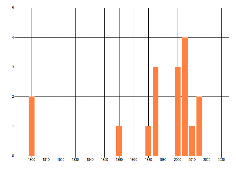Het aantal atlasblokken (5x5 km) waarin de soort is gemeld binnen een periode van vijf jaar (vanaf 1980) of twintig jaar. Niet gecorrigeerd voor waarnemersinspanning en het aantal doorgegeven waarnemingen kan sterk variëren per periode, dus een trend in verspreiding kan hier niet direct uit worden afgelezen. Het opgegeven jaartal is het eerste jaar van de periode. Bron: gevalideerde waarnemingen uit de NDFF.