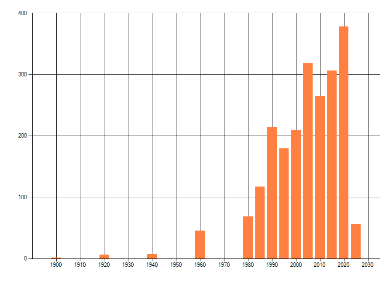Het aantal atlasblokken (5x5 km) waarin de soort is gemeld binnen een periode van vijf jaar (vanaf 1980) of twintig jaar. Niet gecorrigeerd voor waarnemersinspanning en het aantal doorgegeven waarnemingen kan sterk variëren per periode, dus een trend in verspreiding kan hier niet direct uit worden afgelezen. Het opgegeven jaartal is het eerste jaar van de periode. Bron: gevalideerde waarnemingen uit de NDFF.