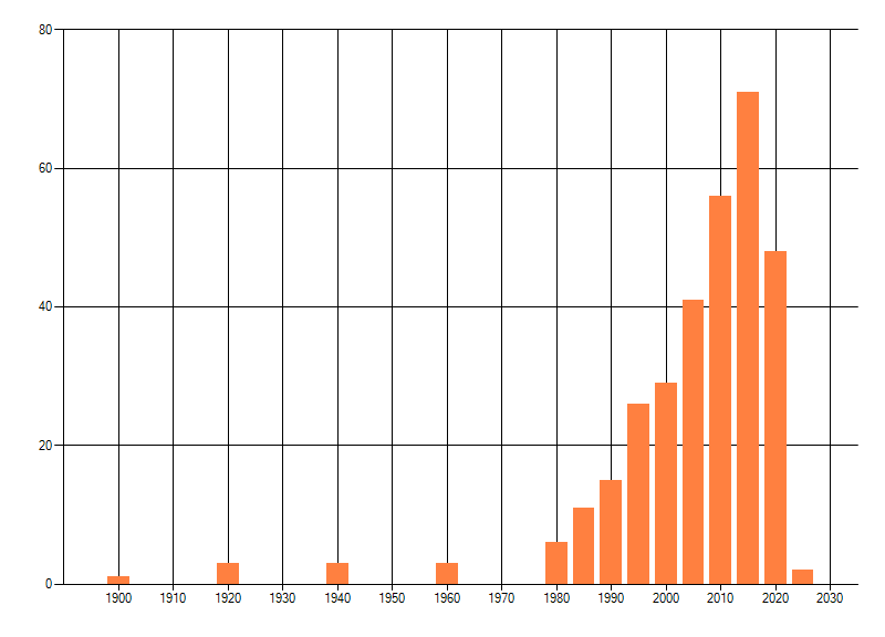 Het aantal atlasblokken (5x5 km) waarin de soort is gemeld binnen een periode van vijf jaar (vanaf 1980) of twintig jaar. Niet gecorrigeerd voor waarnemersinspanning en het aantal doorgegeven waarnemingen kan sterk variëren per periode, dus een trend in verspreiding kan hier niet direct uit worden afgelezen. Het opgegeven jaartal is het eerste jaar van de periode. Bron: gevalideerde waarnemingen uit de NDFF.