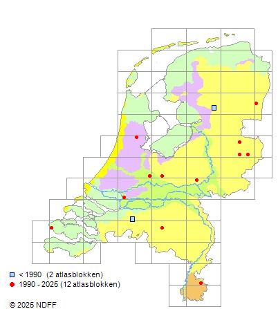 Het aantal atlasblokken (5x5 km) waarin de soort is gemeld binnen een periode van vijf jaar (vanaf 1980) of twintig jaar.