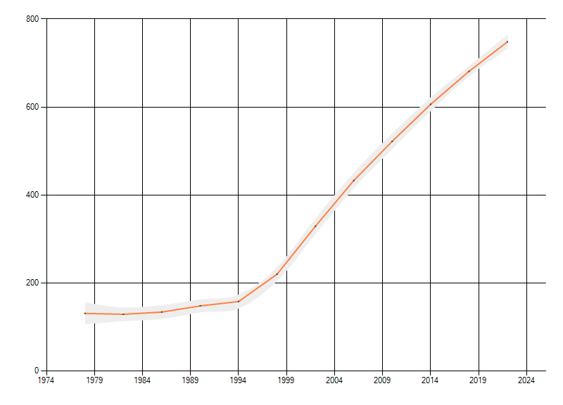 Gemiddelde trend van het aantal kilometerhokken waarin de soort voorkomt, weergegeven als indexcijfer (1975-1978 = 100). De trend is gecorrigeerd voor waarnemersinspanning en geeft de relatieve verandering in het aantal bezette kilometerhokken weer. Voor de berekening worden de data per periode van vier jaar samengenomen. In de grafiek correspondeert ieder punt met het laatste jaar van zo'n periode.
