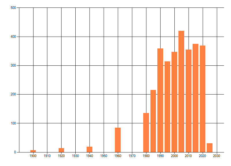 Het aantal atlasblokken (5x5 km) waarin de soort is gemeld binnen een periode van vijf jaar (vanaf 1980) of twintig jaar. Niet gecorrigeerd voor waarnemersinspanning en het aantal doorgegeven waarnemingen kan sterk variëren per periode, dus een trend in verspreiding kan hier niet direct uit worden afgelezen. Het opgegeven jaartal is het eerste jaar van de periode. Bron: gevalideerde waarnemingen uit de NDFF.