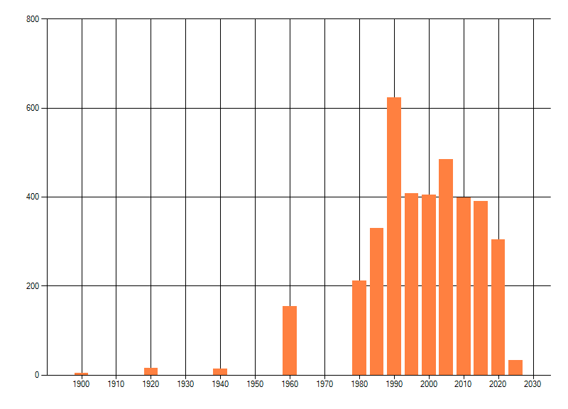 Het aantal atlasblokken (5x5 km) waarin de soort is gemeld binnen een periode van vijf jaar (vanaf 1980) of twintig jaar. Niet gecorrigeerd voor waarnemersinspanning en het aantal doorgegeven waarnemingen kan sterk variëren per periode, dus een trend in verspreiding kan hier niet direct uit worden afgelezen. Het opgegeven jaartal is het eerste jaar van de periode. Bron: gevalideerde waarnemingen uit de NDFF.