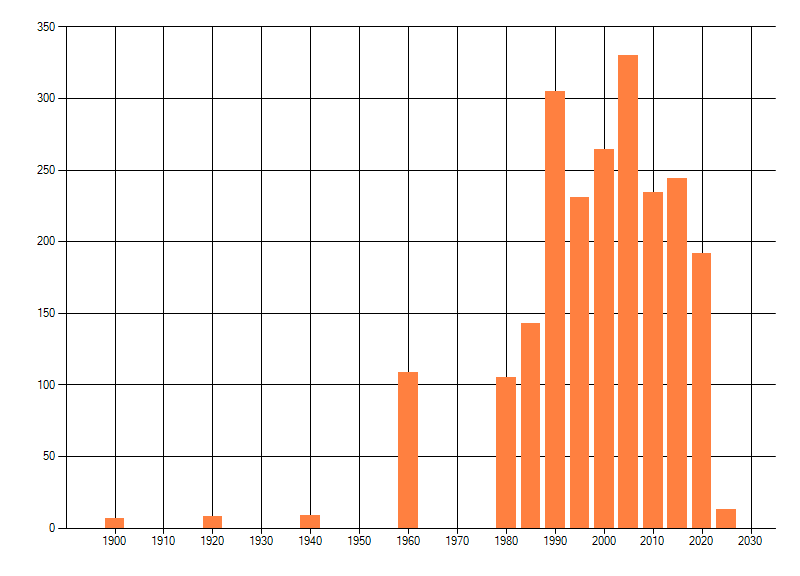 Het aantal atlasblokken (5x5 km) waarin de soort is gemeld binnen een periode van vijf jaar (vanaf 1980) of twintig jaar. Niet gecorrigeerd voor waarnemersinspanning en het aantal doorgegeven waarnemingen kan sterk variëren per periode, dus een trend in verspreiding kan hier niet direct uit worden afgelezen. Het opgegeven jaartal is het eerste jaar van de periode. Bron: gevalideerde waarnemingen uit de NDFF.
