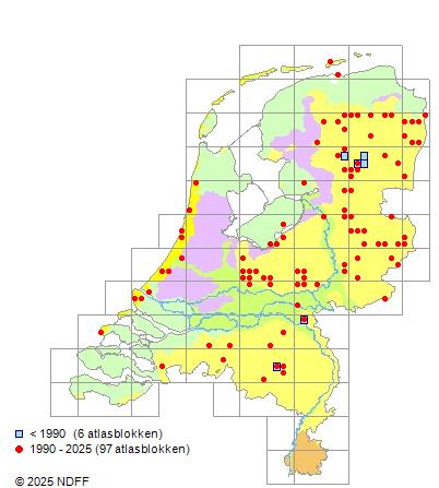 Het aantal atlasblokken (5x5 km) waarin de soort is gemeld binnen een periode van vijf jaar (vanaf 1980) of twintig jaar. Niet gecorrigeerd voor waarnemersinspanning en het aantal doorgegeven waarnemingen kan sterk variëren per periode, dus een trend in verspreiding kan hier niet direct uit worden afgelezen. Het opgegeven jaartal is het eerste jaar van de periode. Bron: gevalideerde waarnemingen uit de NDFF.