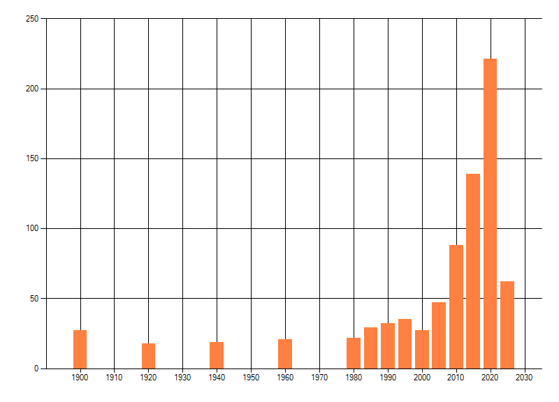 Het aantal atlasblokken (5x5 km) waarin de soort is gemeld binnen een periode van vijf jaar (vanaf 1980) of twintig jaar. Niet gecorrigeerd voor waarnemersinspanning en het aantal doorgegeven waarnemingen kan sterk variëren per periode, dus een trend in verspreiding kan hier niet direct uit worden afgelezen. Het opgegeven jaartal is het eerste jaar van de periode. Bron: gevalideerde waarnemingen uit de NDFF.