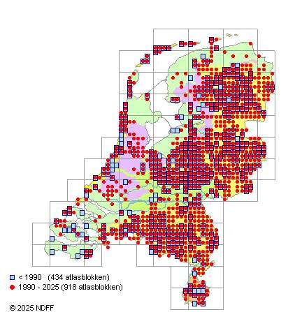 Het aantal atlasblokken (5x5 km) waarin de soort is gemeld binnen een periode van vijf jaar (vanaf 1980) of twintig jaar. Niet gecorrigeerd voor waarnemersinspanning en het aantal doorgegeven waarnemingen kan sterk variëren per periode, dus een trend in verspreiding kan hier niet direct uit worden afgelezen. Het opgegeven jaartal is het eerste jaar van de periode. Bron: gevalideerde waarnemingen uit de NDFF.