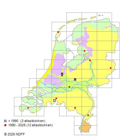 Het aantal atlasblokken (5x5 km) waarin de soort is gemeld binnen een periode van vijf jaar (vanaf 1980) of twintig jaar. Niet gecorrigeerd voor waarnemersinspanning en het aantal doorgegeven waarnemingen kan sterk variëren per periode, dus een trend in verspreiding kan hier niet direct uit worden afgelezen. Het opgegeven jaartal is het eerste jaar van de periode. Bron: gevalideerde waarnemingen uit de NDFF.