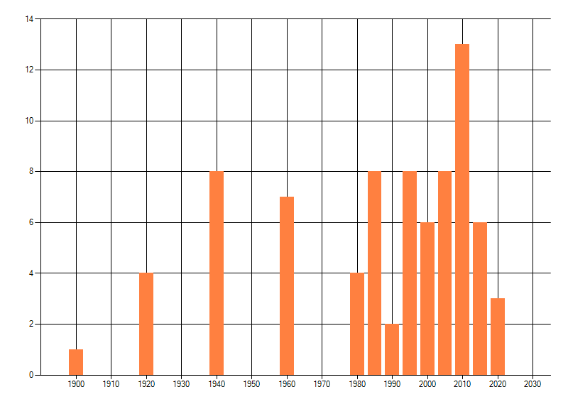Het aantal atlasblokken (5x5 km) waarin de soort is gemeld binnen een periode van vijf jaar (vanaf 1980) of twintig jaar. Niet gecorrigeerd voor waarnemersinspanning en het aantal doorgegeven waarnemingen kan sterk variëren per periode, dus een trend in verspreiding kan hier niet direct uit worden afgelezen. Het opgegeven jaartal is het eerste jaar van de periode. Bron: gevalideerde waarnemingen uit de NDFF.