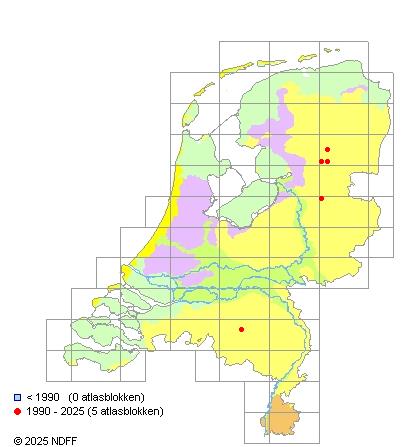 Het aantal atlasblokken (5x5 km) waarin de soort is gemeld binnen een periode van vijf jaar (vanaf 1980) of twintig jaar. Niet gecorrigeerd voor waarnemersinspanning en het aantal doorgegeven waarnemingen kan sterk variëren per periode, dus een trend in verspreiding kan hier niet direct uit worden afgelezen. Het opgegeven jaartal is het eerste jaar van de periode. Bron: gevalideerde waarnemingen uit de NDFF.