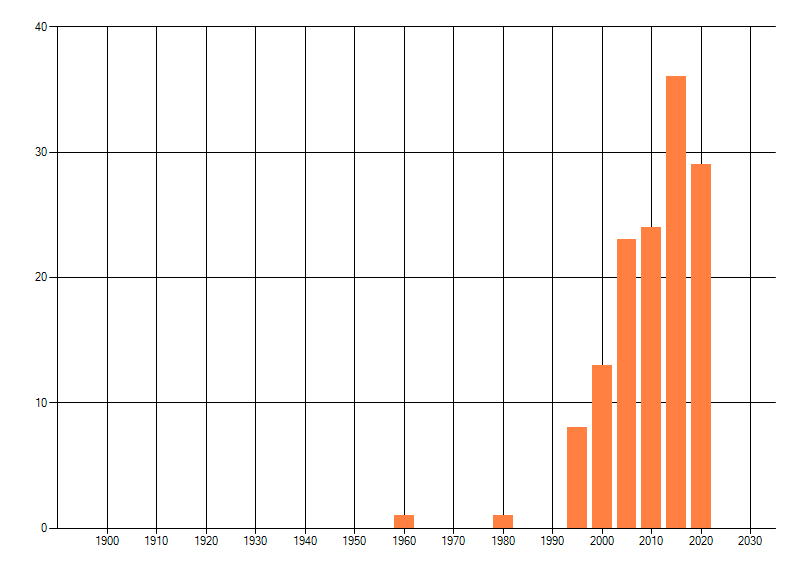 Het aantal atlasblokken (5x5 km) waarin de soort is gemeld binnen een periode van vijf jaar (vanaf 1980) of twintig jaar. Niet gecorrigeerd voor waarnemersinspanning en het aantal doorgegeven waarnemingen kan sterk variëren per periode, dus een trend in verspreiding kan hier niet direct uit worden afgelezen. Het opgegeven jaartal is het eerste jaar van de periode. Bron: gevalideerde waarnemingen uit de NDFF.