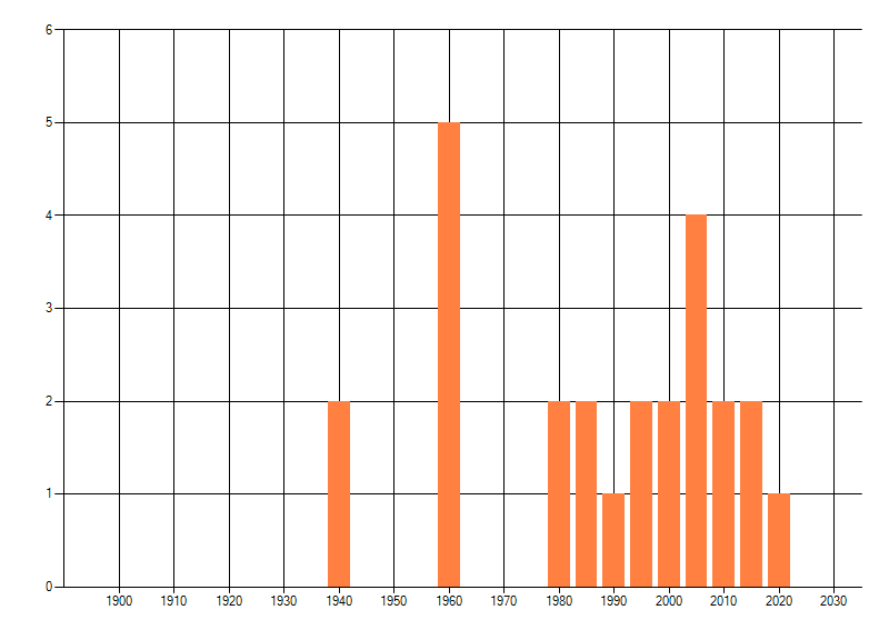 Het aantal atlasblokken (5x5 km) waarin de soort is gemeld binnen een periode van vijf jaar (vanaf 1980) of twintig jaar. Niet gecorrigeerd voor waarnemersinspanning en het aantal doorgegeven waarnemingen kan sterk variëren per periode, dus een trend in verspreiding kan hier niet direct uit worden afgelezen. Het opgegeven jaartal is het eerste jaar van de periode. Bron: gevalideerde waarnemingen uit de NDFF.
