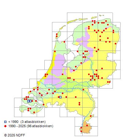 Het aantal atlasblokken (5x5 km) waarin de soort is gemeld binnen een periode van vijf jaar (vanaf 1980) of twintig jaar. Niet gecorrigeerd voor waarnemersinspanning en het aantal doorgegeven waarnemingen kan sterk variëren per periode, dus een trend in verspreiding kan hier niet direct uit worden afgelezen. Het opgegeven jaartal is het eerste jaar van de periode. Bron: gevalideerde waarnemingen uit de NDFF.