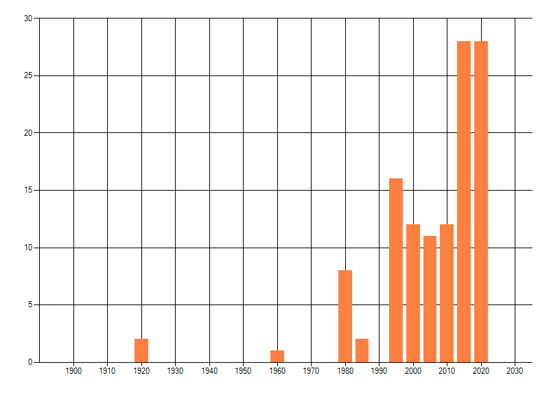 Het aantal atlasblokken (5x5 km) waarin de soort is gemeld binnen een periode van vijf jaar (vanaf 1980) of twintig jaar. Niet gecorrigeerd voor waarnemersinspanning en het aantal doorgegeven waarnemingen kan sterk variëren per periode, dus een trend in verspreiding kan hier niet direct uit worden afgelezen. Het opgegeven jaartal is het eerste jaar van de periode. Bron: gevalideerde waarnemingen uit de NDFF.