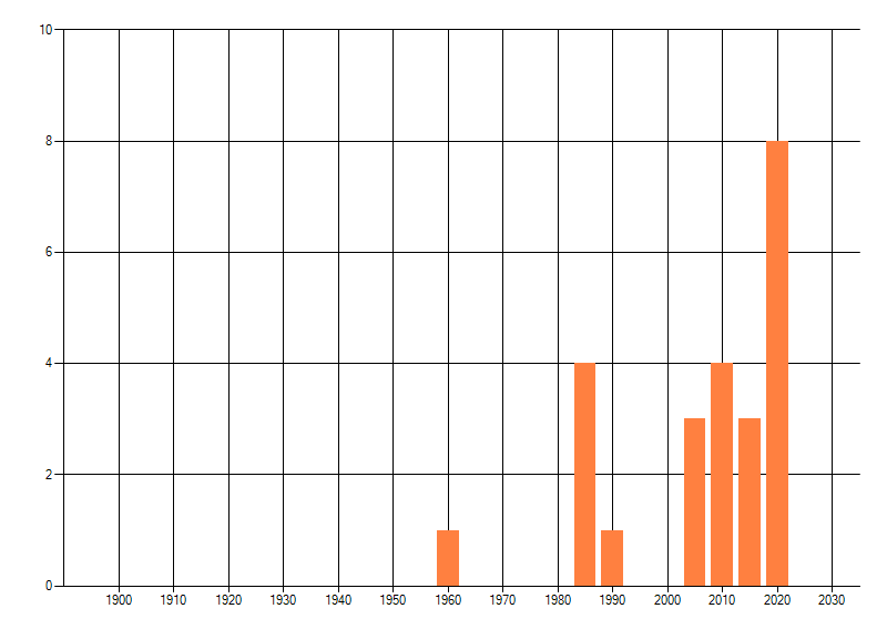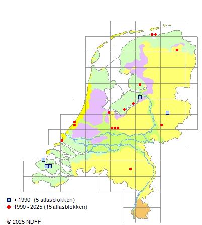 Het aantal atlasblokken (5x5 km) waarin de soort is gemeld binnen een periode van vijf jaar (vanaf 1980) of twintig jaar. Niet gecorrigeerd voor waarnemersinspanning en het aantal doorgegeven waarnemingen kan sterk variëren per periode, dus een trend in verspreiding kan hier niet direct uit worden afgelezen. Het opgegeven jaartal is het eerste jaar van de periode. Bron: gevalideerde waarnemingen uit de NDFF.