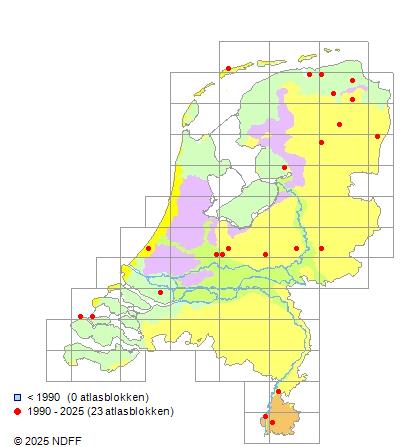 Het aantal atlasblokken (5x5 km) waarin de soort is gemeld binnen een periode van vijf jaar (vanaf 1980) of twintig jaar. Niet gecorrigeerd voor waarnemersinspanning en het aantal doorgegeven waarnemingen kan sterk variëren per periode, dus een trend in verspreiding kan hier niet direct uit worden afgelezen. Het opgegeven jaartal is het eerste jaar van de periode. Bron: gevalideerde waarnemingen uit de NDFF.