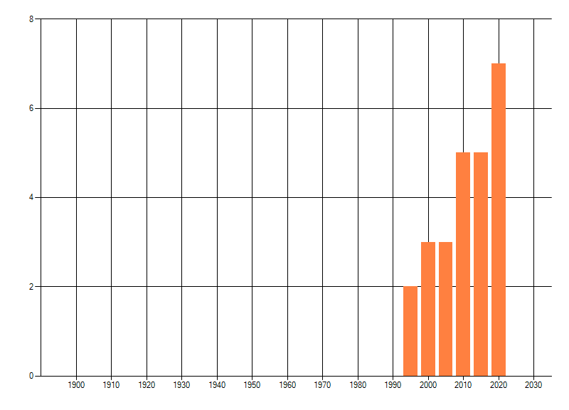 Het aantal atlasblokken (5x5 km) waarin de soort is gemeld binnen een periode van vijf jaar (vanaf 1980) of twintig jaar. Niet gecorrigeerd voor waarnemersinspanning en het aantal doorgegeven waarnemingen kan sterk variëren per periode, dus een trend in verspreiding kan hier niet direct uit worden afgelezen. Het opgegeven jaartal is het eerste jaar van de periode. Bron: gevalideerde waarnemingen uit de NDFF.