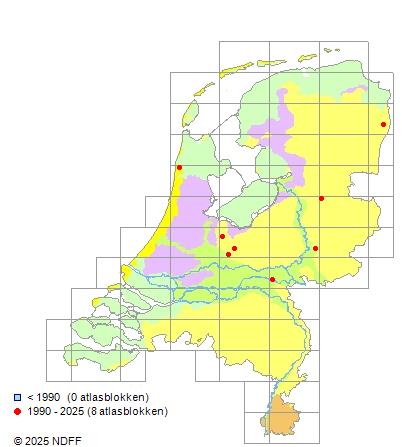 Het aantal atlasblokken (5x5 km) waarin de soort is gemeld binnen een periode van vijf jaar (vanaf 1980) of twintig jaar. Niet gecorrigeerd voor waarnemersinspanning en het aantal doorgegeven waarnemingen kan sterk variëren per periode, dus een trend in verspreiding kan hier niet direct uit worden afgelezen. Het opgegeven jaartal is het eerste jaar van de periode. Bron: gevalideerde waarnemingen uit de NDFF.