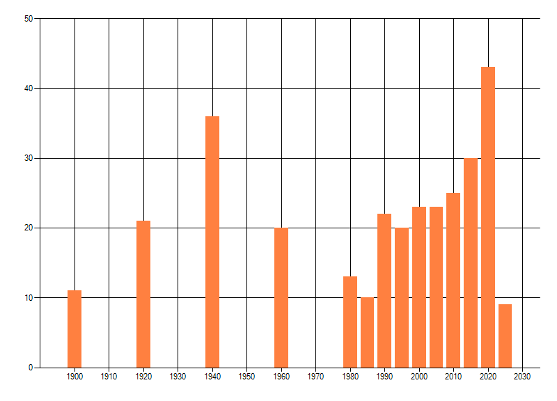 Het aantal atlasblokken (5x5 km) waarin de soort is gemeld binnen een periode van vijf jaar (vanaf 1980) of twintig jaar. Niet gecorrigeerd voor waarnemersinspanning en het aantal doorgegeven waarnemingen kan sterk variëren per periode, dus een trend in verspreiding kan hier niet direct uit worden afgelezen. Het opgegeven jaartal is het eerste jaar van de periode. Bron: gevalideerde waarnemingen uit de NDFF.