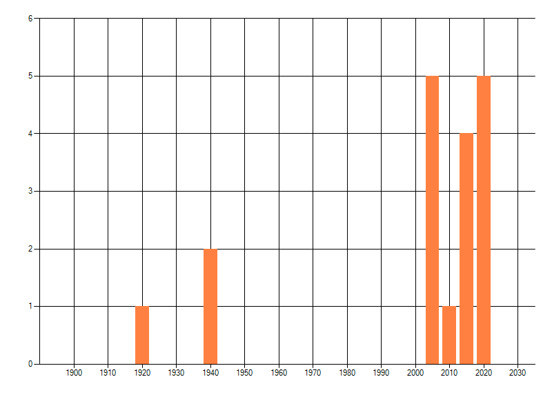 Het aantal atlasblokken (5x5 km) waarin de soort is gemeld binnen een periode van vijf jaar (vanaf 1980) of twintig jaar. Niet gecorrigeerd voor waarnemersinspanning en het aantal doorgegeven waarnemingen kan sterk variëren per periode, dus een trend in verspreiding kan hier niet direct uit worden afgelezen. Het opgegeven jaartal is het eerste jaar van de periode. Bron: gevalideerde waarnemingen uit de NDFF.