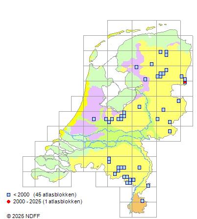 Het aantal atlasblokken (5x5 km) waarin de soort is gemeld binnen een periode van vijf jaar (vanaf 1980) of twintig jaar. Niet gecorrigeerd voor waarnemersinspanning en het aantal doorgegeven waarnemingen kan sterk variëren per periode, dus een trend in verspreiding kan hier niet direct uit worden afgelezen. Het opgegeven jaartal is het eerste jaar van de periode. Bron: gevalideerde waarnemingen uit de NDFF.