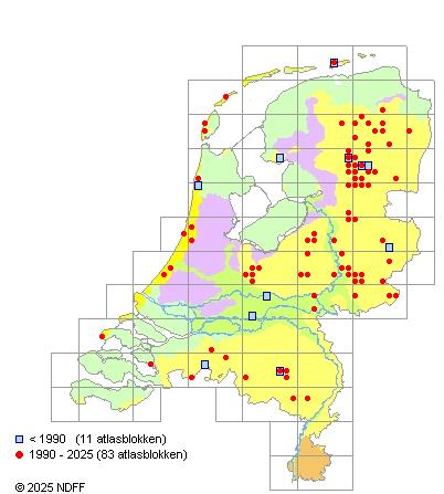 Het aantal atlasblokken (5x5 km) waarin de soort is gemeld binnen een periode van vijf jaar (vanaf 1980) of twintig jaar. Niet gecorrigeerd voor waarnemersinspanning en het aantal doorgegeven waarnemingen kan sterk variëren per periode, dus een trend in verspreiding kan hier niet direct uit worden afgelezen. Het opgegeven jaartal is het eerste jaar van de periode. Bron: gevalideerde waarnemingen uit de NDFF.