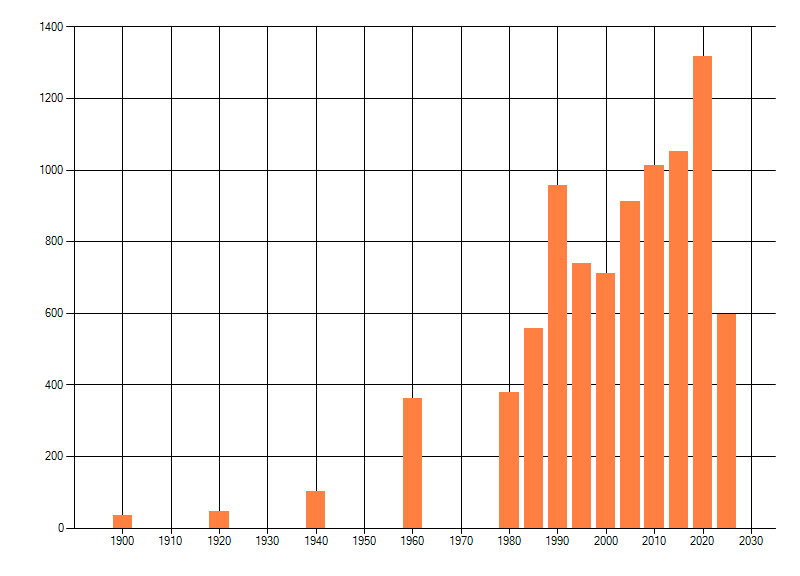 Het aantal atlasblokken (5x5 km) waarin de soort is gemeld binnen een periode van vijf jaar (vanaf 1980) of twintig jaar. Niet gecorrigeerd voor waarnemersinspanning en het aantal doorgegeven waarnemingen kan sterk variëren per periode, dus een trend in verspreiding kan hier niet direct uit worden afgelezen. Het opgegeven jaartal is het eerste jaar van de periode. Bron: gevalideerde waarnemingen uit de NDFF.