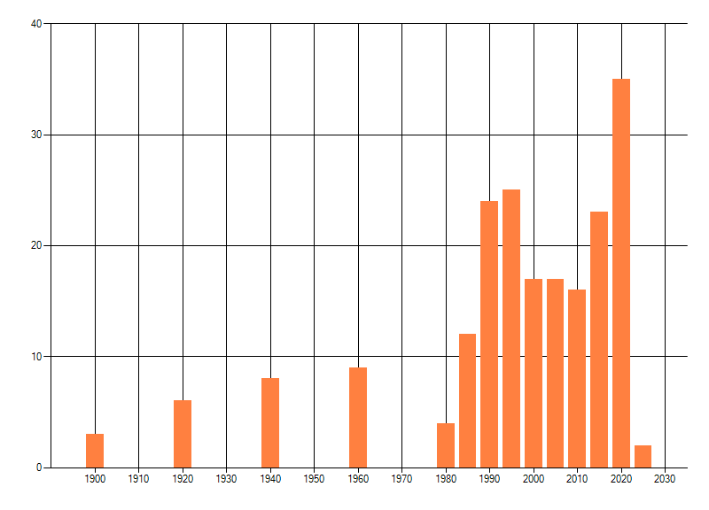 Het aantal atlasblokken (5x5 km) waarin de soort is gemeld binnen een periode van vijf jaar (vanaf 1980) of twintig jaar. Niet gecorrigeerd voor waarnemersinspanning en het aantal doorgegeven waarnemingen kan sterk variëren per periode, dus een trend in verspreiding kan hier niet direct uit worden afgelezen. Het opgegeven jaartal is het eerste jaar van de periode. Bron: gevalideerde waarnemingen uit de NDFF.