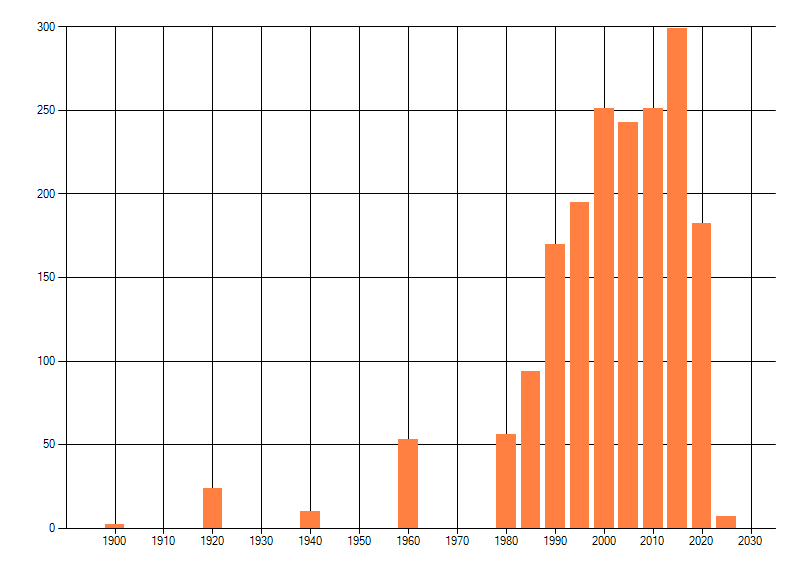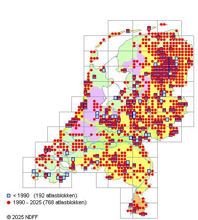 Het aantal atlasblokken (5x5 km) waarin de soort is gemeld binnen een periode van vijf jaar (vanaf 1980) of twintig jaar. Niet gecorrigeerd voor waarnemersinspanning en het aantal doorgegeven waarnemingen kan sterk variëren per periode, dus een trend in verspreiding kan hier niet direct uit worden afgelezen. Het opgegeven jaartal is het eerste jaar van de periode. Bron: gevalideerde waarnemingen uit de NDFF.