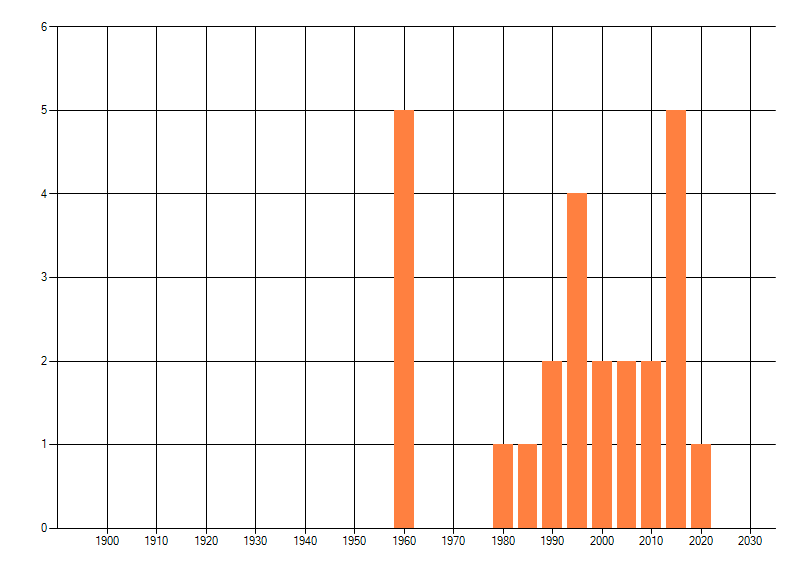 Het aantal atlasblokken (5x5 km) waarin de soort is gemeld binnen een periode van vijf jaar (vanaf 1980) of twintig jaar. Niet gecorrigeerd voor waarnemersinspanning en het aantal doorgegeven waarnemingen kan sterk variëren per periode, dus een trend in verspreiding kan hier niet direct uit worden afgelezen. Het opgegeven jaartal is het eerste jaar van de periode. Bron: gevalideerde waarnemingen uit de NDFF.