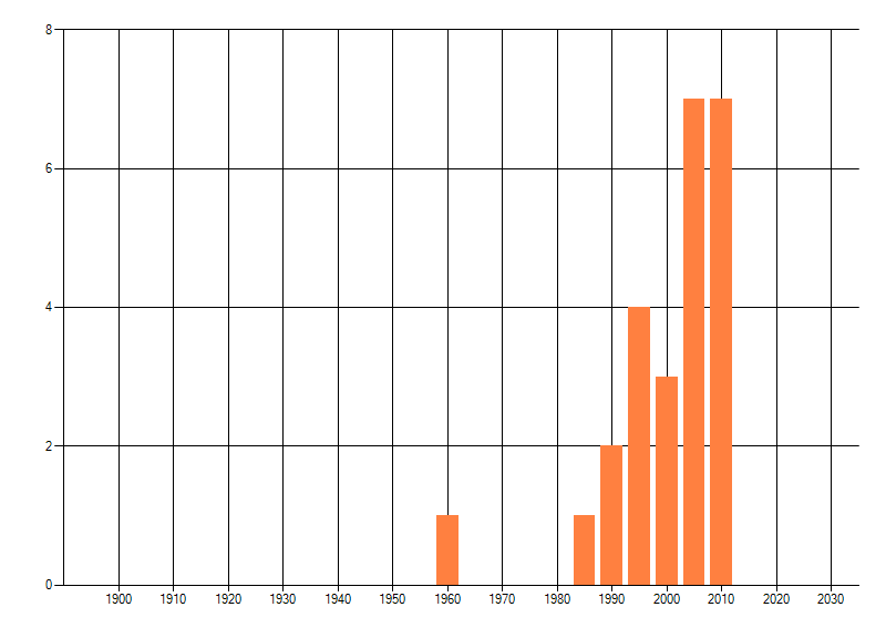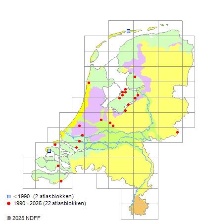 Het aantal atlasblokken (5x5 km) waarin de soort is gemeld binnen een periode van vijf jaar (vanaf 1980) of twintig jaar. Niet gecorrigeerd voor waarnemersinspanning en het aantal doorgegeven waarnemingen kan sterk variëren per periode, dus een trend in verspreiding kan hier niet direct uit worden afgelezen. Het opgegeven jaartal is het eerste jaar van de periode. Bron: gevalideerde waarnemingen uit de NDFF.