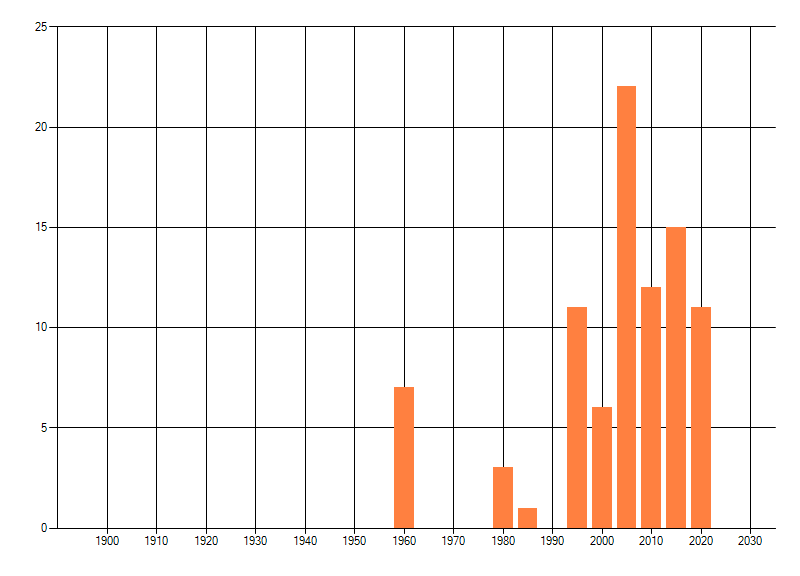 Het aantal atlasblokken (5x5 km) waarin de soort is gemeld binnen een periode van vijf jaar (vanaf 1980) of twintig jaar. Niet gecorrigeerd voor waarnemersinspanning en het aantal doorgegeven waarnemingen kan sterk variëren per periode, dus een trend in verspreiding kan hier niet direct uit worden afgelezen. Het opgegeven jaartal is het eerste jaar van de periode. Bron: gevalideerde waarnemingen uit de NDFF.