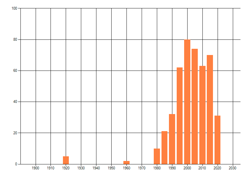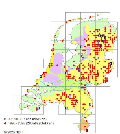 Het aantal atlasblokken (5x5 km) waarin de soort is gemeld binnen een periode van vijf jaar (vanaf 1980) of twintig jaar. Niet gecorrigeerd voor waarnemersinspanning en het aantal doorgegeven waarnemingen kan sterk variëren per periode, dus een trend in verspreiding kan hier niet direct uit worden afgelezen. Het opgegeven jaartal is het eerste jaar van de periode. Bron: gevalideerde waarnemingen uit de NDFF.