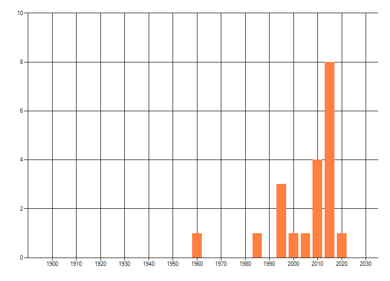 Het aantal atlasblokken (5x5 km) waarin de soort is gemeld binnen een periode van vijf jaar (vanaf 1980) of twintig jaar. Niet gecorrigeerd voor waarnemersinspanning en het aantal doorgegeven waarnemingen kan sterk variëren per periode, dus een trend in verspreiding kan hier niet direct uit worden afgelezen. Het opgegeven jaartal is het eerste jaar van de periode. Bron: gevalideerde waarnemingen uit de NDFF.