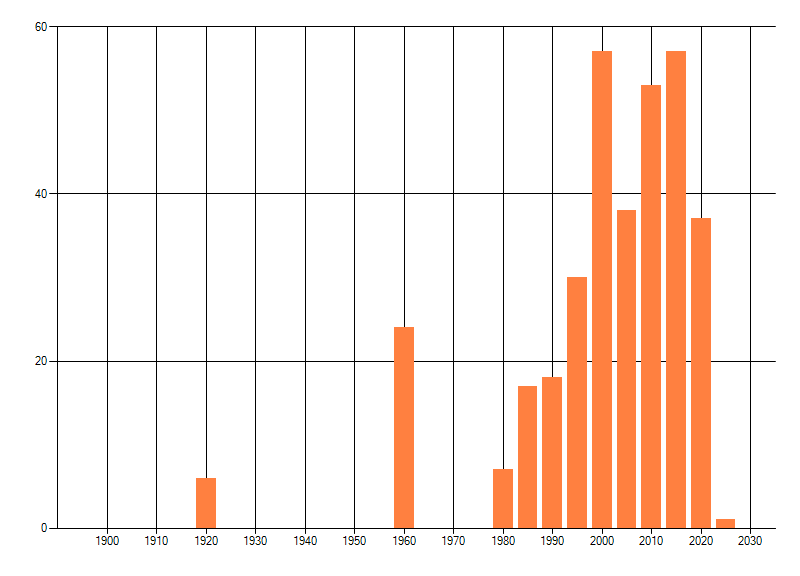 Het aantal atlasblokken (5x5 km) waarin de soort is gemeld binnen een periode van vijf jaar (vanaf 1980) of twintig jaar. Niet gecorrigeerd voor waarnemersinspanning en het aantal doorgegeven waarnemingen kan sterk variëren per periode, dus een trend in verspreiding kan hier niet direct uit worden afgelezen. Het opgegeven jaartal is het eerste jaar van de periode. Bron: gevalideerde waarnemingen uit de NDFF.
