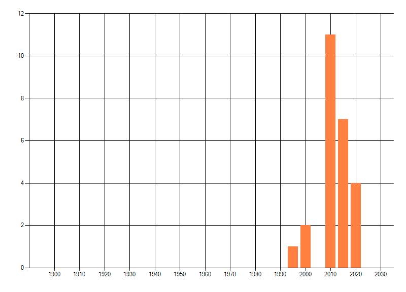 Het aantal atlasblokken (5x5 km) waarin de soort is gemeld binnen een periode van vijf jaar (vanaf 1980) of twintig jaar. Niet gecorrigeerd voor waarnemersinspanning en het aantal doorgegeven waarnemingen kan sterk variëren per periode, dus een trend in verspreiding kan hier niet direct uit worden afgelezen. Het opgegeven jaartal is het eerste jaar van de periode. Bron: gevalideerde waarnemingen uit de NDFF.