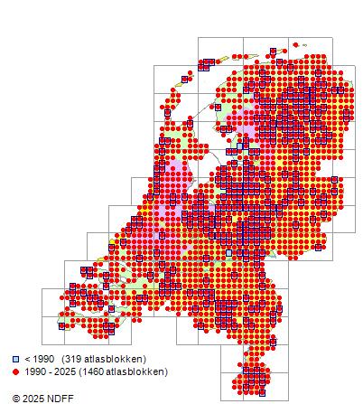 Het aantal atlasblokken (5x5 km) waarin de soort is gemeld binnen een periode van vijf jaar (vanaf 1980) of twintig jaar. Niet gecorrigeerd voor waarnemersinspanning en het aantal doorgegeven waarnemingen kan sterk variëren per periode, dus een trend in verspreiding kan hier niet direct uit worden afgelezen. Het opgegeven jaartal is het eerste jaar van de periode. Bron: gevalideerde waarnemingen uit de NDFF.