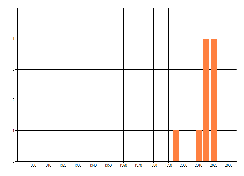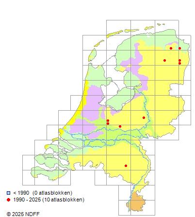 Het aantal atlasblokken (5x5 km) waarin de soort is gemeld binnen een periode van vijf jaar (vanaf 1980) of twintig jaar. Niet gecorrigeerd voor waarnemersinspanning en het aantal doorgegeven waarnemingen kan sterk variëren per periode, dus een trend in verspreiding kan hier niet direct uit worden afgelezen. Het opgegeven jaartal is het eerste jaar van de periode. Bron: gevalideerde waarnemingen uit de NDFF.