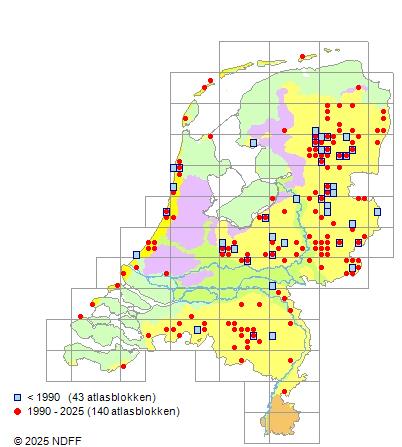 Het aantal atlasblokken (5x5 km) waarin de soort is gemeld binnen een periode van vijf jaar (vanaf 1980) of twintig jaar. Niet gecorrigeerd voor waarnemersinspanning en het aantal doorgegeven waarnemingen kan sterk variëren per periode, dus een trend in verspreiding kan hier niet direct uit worden afgelezen. Het opgegeven jaartal is het eerste jaar van de periode. Bron: gevalideerde waarnemingen uit de NDFF.