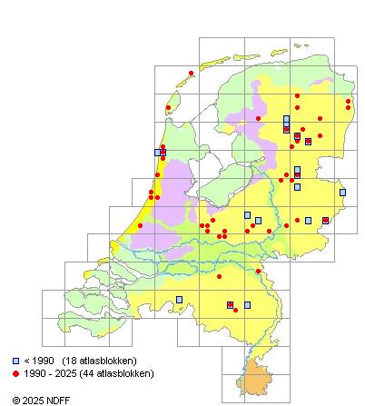 Het aantal atlasblokken (5x5 km) waarin de soort is gemeld binnen een periode van vijf jaar (vanaf 1980) of twintig jaar. Niet gecorrigeerd voor waarnemersinspanning en het aantal doorgegeven waarnemingen kan sterk variëren per periode, dus een trend in verspreiding kan hier niet direct uit worden afgelezen. Het opgegeven jaartal is het eerste jaar van de periode. Bron: gevalideerde waarnemingen uit de NDFF.