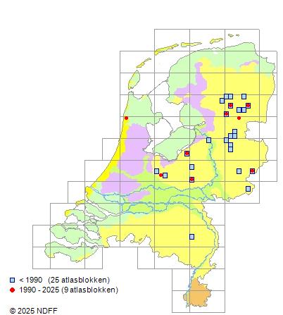 Het aantal atlasblokken (5x5 km) waarin de soort is gemeld binnen een periode van vijf jaar (vanaf 1980) of twintig jaar. Niet gecorrigeerd voor waarnemersinspanning en het aantal doorgegeven waarnemingen kan sterk variëren per periode, dus een trend in verspreiding kan hier niet direct uit worden afgelezen. Het opgegeven jaartal is het eerste jaar van de periode. Bron: gevalideerde waarnemingen uit de NDFF.