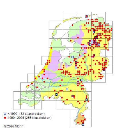 Het aantal atlasblokken (5x5 km) waarin de soort is gemeld binnen een periode van vijf jaar (vanaf 1980) of twintig jaar. Niet gecorrigeerd voor waarnemersinspanning en het aantal doorgegeven waarnemingen kan sterk variëren per periode, dus een trend in verspreiding kan hier niet direct uit worden afgelezen. Het opgegeven jaartal is het eerste jaar van de periode. Bron: gevalideerde waarnemingen uit de NDFF.