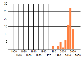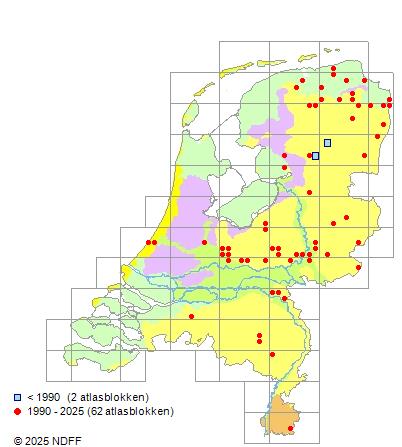 Het aantal atlasblokken (5x5 km) waarin de soort is gemeld binnen een periode van vijf jaar (vanaf 1980) of twintig jaar. Niet gecorrigeerd voor waarnemersinspanning en het aantal doorgegeven waarnemingen kan sterk variëren per periode, dus een trend in verspreiding kan hier niet direct uit worden afgelezen. Het opgegeven jaartal is het eerste jaar van de periode. Bron: gevalideerde waarnemingen uit de NDFF.