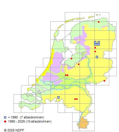 Het aantal atlasblokken (5x5 km) waarin de soort is gemeld binnen een periode van vijf jaar (vanaf 1980) of twintig jaar. Niet gecorrigeerd voor waarnemersinspanning en het aantal doorgegeven waarnemingen kan sterk variëren per periode, dus een trend in verspreiding kan hier niet direct uit worden afgelezen. Het opgegeven jaartal is het eerste jaar van de periode. Bron: gevalideerde waarnemingen uit de NDFF.