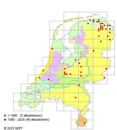 Het aantal atlasblokken (5x5 km) waarin de soort is gemeld binnen een periode van vijf jaar (vanaf 1980) of twintig jaar. Niet gecorrigeerd voor waarnemersinspanning en het aantal doorgegeven waarnemingen kan sterk variëren per periode, dus een trend in verspreiding kan hier niet direct uit worden afgelezen. Het opgegeven jaartal is het eerste jaar van de periode. Bron: gevalideerde waarnemingen uit de NDFF.