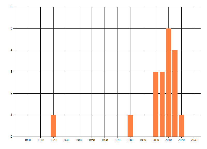 Het aantal atlasblokken (5x5 km) waarin de soort is gemeld binnen een periode van vijf jaar (vanaf 1980) of twintig jaar. Niet gecorrigeerd voor waarnemersinspanning en het aantal doorgegeven waarnemingen kan sterk variëren per periode, dus een trend in verspreiding kan hier niet direct uit worden afgelezen. Het opgegeven jaartal is het eerste jaar van de periode. Bron: gevalideerde waarnemingen uit de NDFF.
