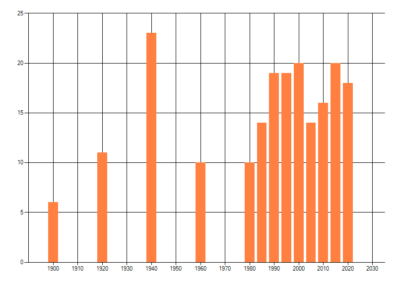 Het aantal atlasblokken (5x5 km) waarin de soort is gemeld binnen een periode van vijf jaar (vanaf 1980) of twintig jaar. Niet gecorrigeerd voor waarnemersinspanning en het aantal doorgegeven waarnemingen kan sterk variëren per periode, dus een trend in verspreiding kan hier niet direct uit worden afgelezen. Het opgegeven jaartal is het eerste jaar van de periode. Bron: gevalideerde waarnemingen uit de NDFF.