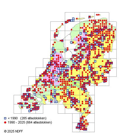 Het aantal atlasblokken (5x5 km) waarin de soort is gemeld binnen een periode van vijf jaar (vanaf 1980) of twintig jaar. Niet gecorrigeerd voor waarnemersinspanning en het aantal doorgegeven waarnemingen kan sterk variëren per periode, dus een trend in verspreiding kan hier niet direct uit worden afgelezen. Het opgegeven jaartal is het eerste jaar van de periode. Bron: gevalideerde waarnemingen uit de NDFF.