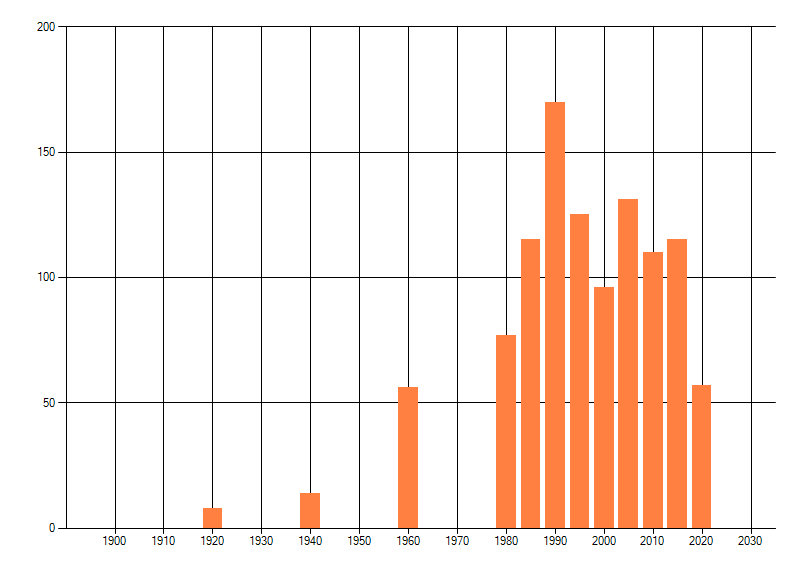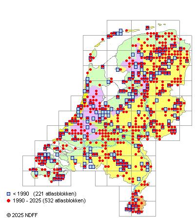 Het aantal atlasblokken (5x5 km) waarin de soort is gemeld binnen een periode van vijf jaar (vanaf 1980) of twintig jaar. Niet gecorrigeerd voor waarnemersinspanning en het aantal doorgegeven waarnemingen kan sterk variëren per periode, dus een trend in verspreiding kan hier niet direct uit worden afgelezen. Het opgegeven jaartal is het eerste jaar van de periode. Bron: gevalideerde waarnemingen uit de NDFF.